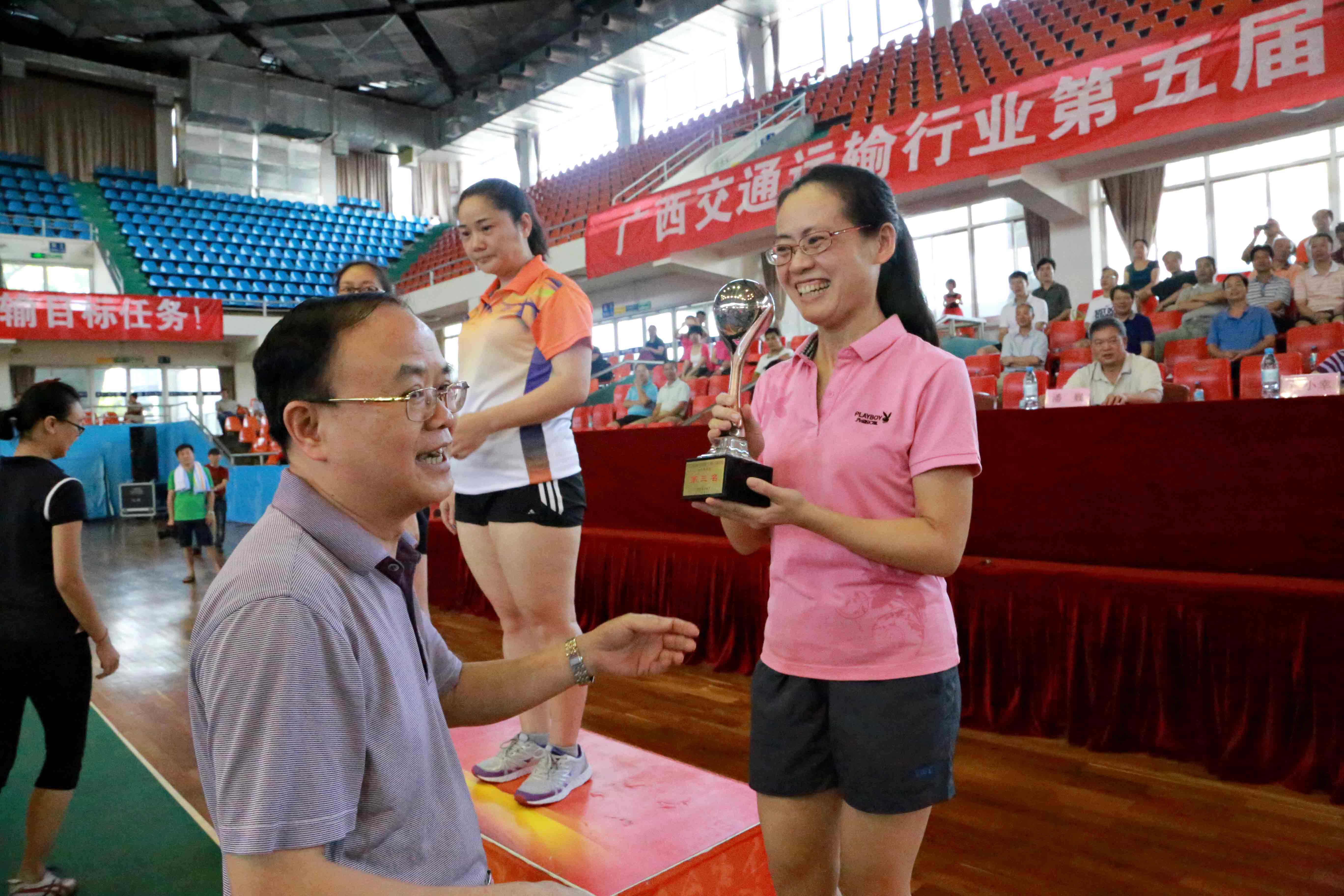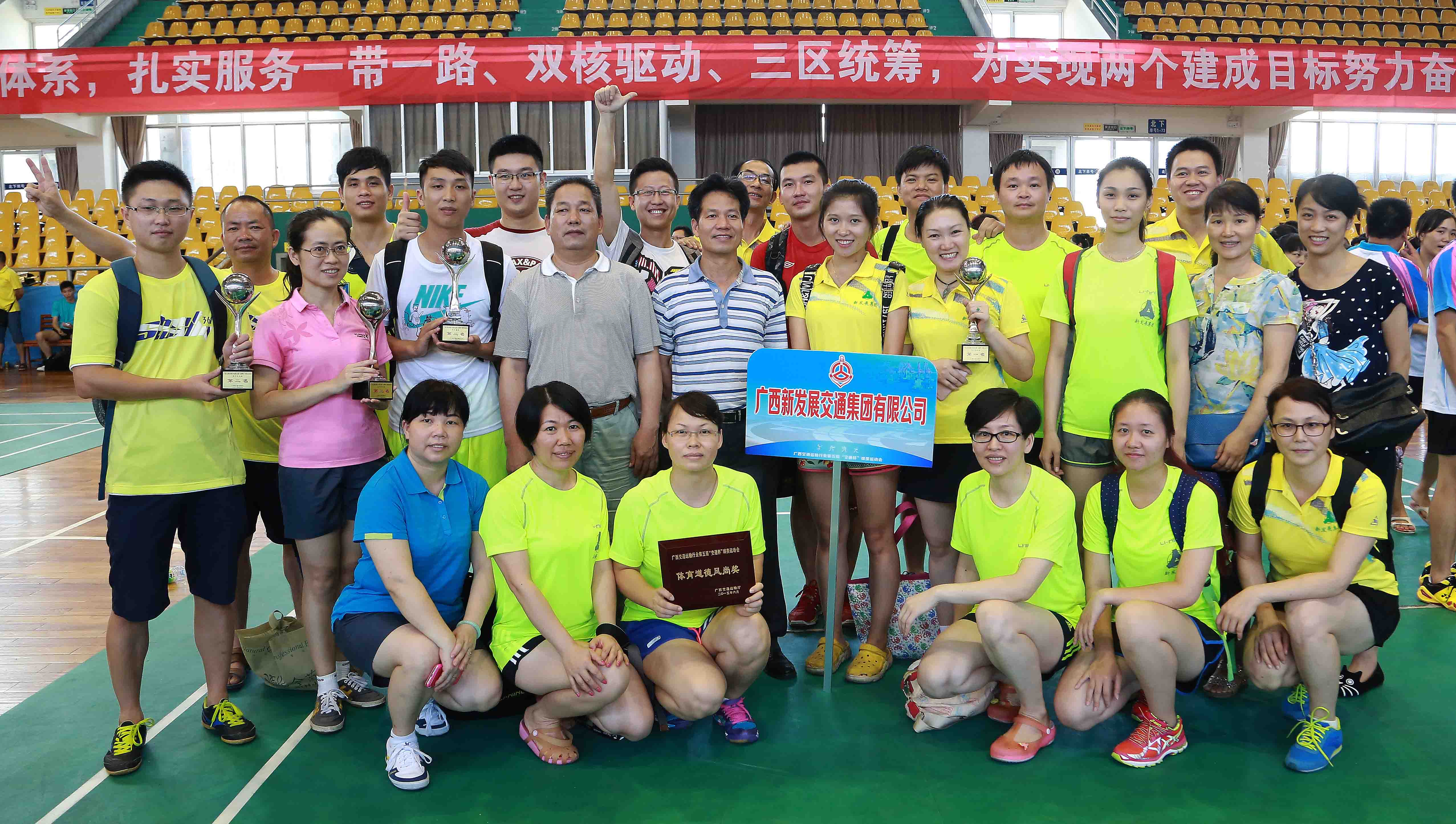 6月26-28日,廣西交通運(yùn)輸行業(yè)第五屆“交通杯”球類運(yùn)動(dòng)會(huì)在廣西體育館舉辦,共有27個(gè)單位、企業(yè)參加了本屆運(yùn)動(dòng)會(huì)。我集團(tuán)公司朱堅(jiān)和董事長(zhǎng)、黨委書記為團(tuán)長(zhǎng),劉明洪、張友坐、鄧遠(yuǎn)志、覃炳賢等領(lǐng)導(dǎo)班子成員為副團(tuán)長(zhǎng),率團(tuán)參加運(yùn)動(dòng)會(huì)。集團(tuán)公司代表團(tuán)(70余名運(yùn)動(dòng)員)在連續(xù)3天的運(yùn)動(dòng)會(huì)日程里,參與了男子籃球、氣排球(男子組、女子組)、乒乓球(男子團(tuán)體、女子團(tuán)體)、羽毛球(男子團(tuán)體、女子團(tuán)體)等比賽項(xiàng)目競(jìng)技,并獲得優(yōu)異成績(jī)。