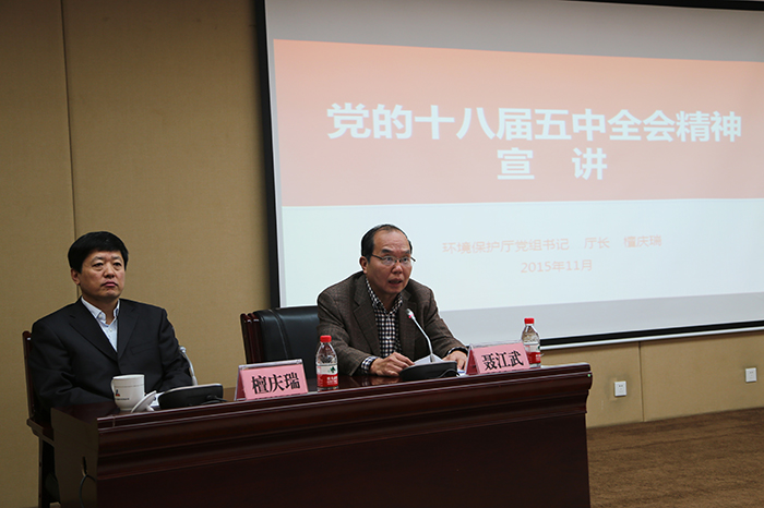 自治區(qū)環(huán)境保護廳廳長檀慶瑞作宣講,自治區(qū)國資委副主任、黨委副書記、巡視員聶江武主持宣講會。