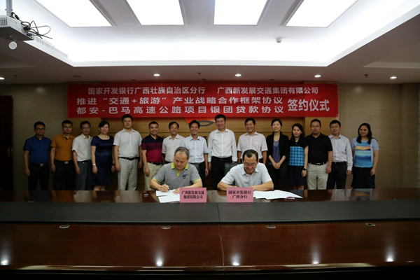 6月9日,集團公司與國家開發(fā)銀行廣西分行在南寧簽訂戰(zhàn)略合作框架協(xié)議。集團公司黨委書記、董事長朱堅和,黨委副書記、副董事長、總經(jīng)理唐咸秋,黨委委員、總會計師鄧遠(yuǎn)志,國家開發(fā)銀行廣西分行黨委書記、行長謝志軍,副行長呂軍等領(lǐng)導(dǎo)出席簽約儀式。簽約前,雙方進(jìn)行了友好會談,雙方重點圍繞賀州至巴馬高速公路、融水至河池高速公路、國省干線公路及沿線地區(qū)的“交通+旅游”項目開展深度戰(zhàn)略合作等方面進(jìn)行了深入的交流與探討,并達(dá)成了一致共識。座談會后,唐咸秋與呂軍分別代表雙方簽訂戰(zhàn)略合作框架協(xié)議。雙方有關(guān)部門負(fù)責(zé)人參加簽約儀式。(集團公司 投資改革發(fā)展部)