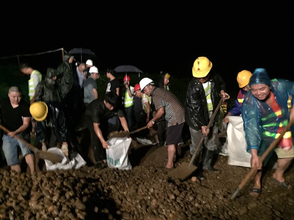 “十萬壟大堤出現(xiàn)險情,大家快去救援?!?月1日21時,湖南省湘潭市,廣西路橋集團(tuán)環(huán)東路項目經(jīng)理部項目常務(wù)副總工程師宋佩超立即組織項目經(jīng)理部員工一起奔赴一線。當(dāng)時湘潭市十萬壟湘江大堤出現(xiàn)直徑約20公分左右管涌,情況十分緊急,附近的新馬路項目部出動挖掘機和裝載機進(jìn)行搶險救援。同時,項目經(jīng)理部全體員工與當(dāng)?shù)鼐仍犖橐黄鹋牌鹆碎L龍,齊聲喊著口號“一二”、“一二”裝沙袋、傳運沙袋,幫助封堵大堤漏洞。